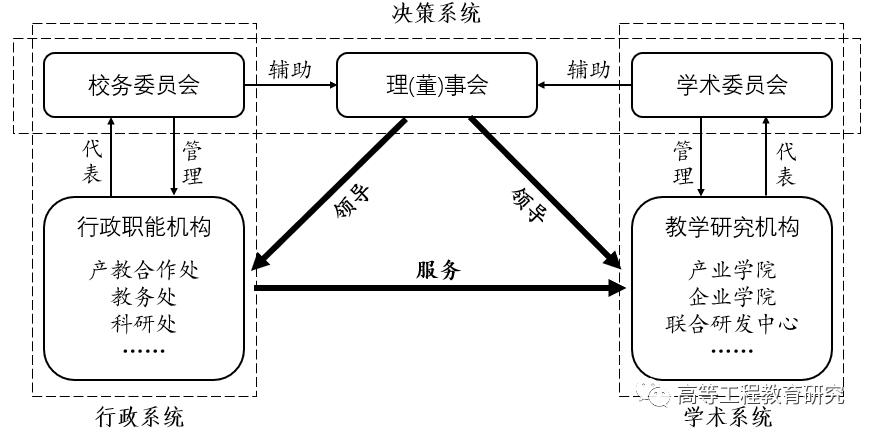 新制度主义学派将场域的组织和个体视为“能动者”,主张用“双重建构视角”看待场域制度:一方面,制度为组织提供样板与指南;另一方面,组织内部参与者“社会互动会促进制度之含义的建构与发展”。[23] 职业大学发展过程中,需要职业大学以“制度企业家”姿态创新职业大学内部治理结构,以自身行动捍卫高等职业教育场域的应用导向制度逻辑。从高等教育层次属性上说,职业大学是大学,其内部治理与普通本科大学总体结构有相似性,都由决策系统、学术系统和行政系统组成,决策系统领导学术系统与行政系统,行政系统为学术系统服务,同时学术系统和行政系统均有代表机构参与决策系统(见图2)。职业大学内部治理与普通本科大学又存在差异,表现为决策机制上更多利益主体参与并相互制衡,组织机构上按产业逻辑创新基层组织并鼓励基层“创业型自治”,师资队伍上强调“双师素能”与“双师结构”,稳固职业大学内部应用导向制度逻辑。