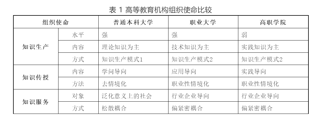 知识生产、知识传授及通过知识服务社会,是所有高校的共同使命。但不同类型高校使命的具体职责与实现方式存在差异(见表1)。知识生产水平上,本科层次大学比专科层次学院的水平要求更高。普通本科大学主要生产理论知识,高职学院主要生产实践知识,职业大学则以生产技术知识为主。受知识性质影响,知识生产方式上,普通本科大学以吉本斯(Gibbons M.)知识生产模式1为主,是被制度化于大学结构的基于学科的、线性的、封闭的知识生产。职业大学和高职学院以知识生产模式2为主,是在应用环境中为解决问题而进行的知识生产,具有应用情境性、跨学科性、异质性与组织多样性等特点。从知识传授看,普通本科大学坚持学问导向,培养理论基础宽厚、专业知识扎实、具有较高综合素养的专门人才。职业大学与高职学院均以培养面向生产服务一线高层次技术技能型人才为已任,教学上突出职业情境性。高职学院教学内容的实践性强于职业大学,职业大学更侧重理论与实践间建立联系,即应用导向。从社会服务看,普通本科大学与社会经济是松散耦合关系,以公共知识服务于泛化意义的社会,引领社会变革。职业大学和高职学院则面向地方经济,与行业企业密切合作,人才培养和知识生产均带有较明显的行业甚至企业导向。这种偏紧密的耦合关系,本质是由应用知识和实践知识的情境属性决定的。脱离真实生产服务情境,应用知识和实践知识生产就缺少动力和活力。要在真实生产服务情境中生产应用知识和实践知识,就必须向合作企业让渡知识的公共性,因为逐利是企业的本性。可见,职业大学可以也应该有自己独特办学定位,即高等教育层次要求与职业教育类型要求相互融合。职业大学治理目标是要使职业大学形成并坚持这样的办学定位,同时提高办学效能。