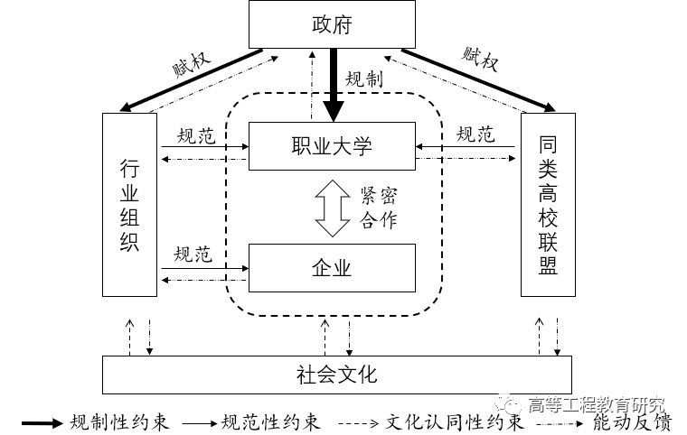 学术自治被认为是大学的“原生制度”,是“大学的灵魂与标志”。[16] 现代社会知识生产模式发生了变革,知识的弥散性特征日益明显,知识生产的边界日益模糊。大学作为知识中心及知识绝对权威的地位被打破,由此倒逼大学治理结构变革,社会利益相关方共同参与合作治理成为趋势。适当、积极的外部干预“不仅不会阻碍学术自由,反而能促进和保障学术自由”,它有助于“避免大学因自治而产生的脱离社会实际,及学者因过于自由放纵而产生的偏执保守”。[17] 职业大学治理更应遵循自治性与开放性并存原则。职业教育是“跨界”的教育,“是教育与职业的联姻,学校和企业的携手,政府与教育的联结,行业与职业的交集”,必须采取“政行企校四位一体的多元共治结构”。[18] 同时,职业大学也不应完全服膺于外部干预,异化为经济组织的附庸,失去其作为社会性知识生产共同体的“大学”本色。
