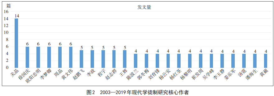对现代学徒制的研究成果进行系统梳理和分析,不仅可以了解相关研究的热点、演进趋势和未来走向,提供丰富的理论基础,还可以为现代学徒制实践提供一定的指导。科学知识图谱分析运用计算机科学、科学计量学以及信息可视化技术,基于一定文献数据的聚类分析、社会网络分析等,以揭示特定研究领域的概念子域和主题演进。鉴于此,本研究以文献共词分析软件Bicomb构建的词篇矩阵为基础,通过Ucinet和gCLUTO软件对我国2003—2019年现代学徒制研究的年载文量、核心作者、机构分布和热点等进行分析,旨在厘清我国现代学徒制的研究现状和特点,为后续研究提供一定的借鉴和参考。