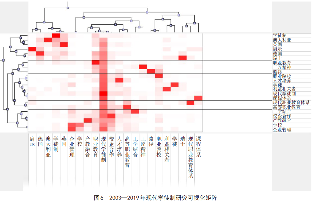 基于对类内关键词的语义关系和每个类内代表文献的解读,总结出2003—2019年现代学徒制的六个研究热点。