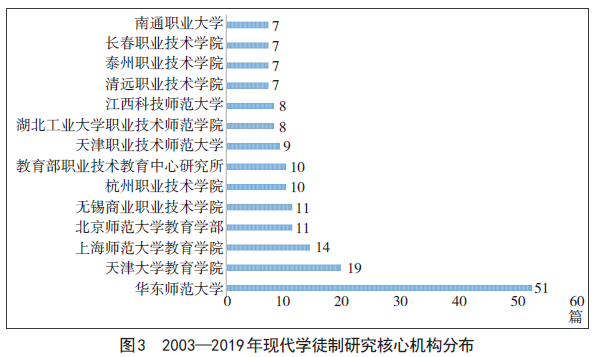 从图3中不难看出,一方面,从事现代学徒制研究的人员主要集中于高校,另一方面,在高校内部高职院校成为不可忽视的生力军,几乎占总数的1/2。