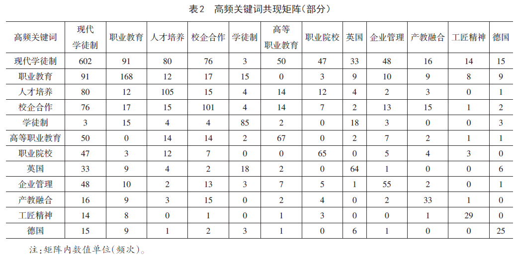 “关键词是文献观点与思想的凝练,是研究活动的缩影,是文献计量分析的重要指标”,不仅在一定程度上体现出现代学徒制研究领域所关注的热点和主题,而且收集起来方便。运用Bicomb2.0软件对文献的关键词词频进行提取和统计,对意义相近的一些关键词进行合并处理,如将“高职”和“高职教育”合并为“高等职业教育”,等等。对958篇文献中1655个关键词进行排序后,提取累计出现频数≥13的关键词作为高频关键词(累计频次百分比为39.86%),共计22个。根据关键词频次,从高到低进行排序,在一定程度上代表了现代学徒制的研究热点(表1)。