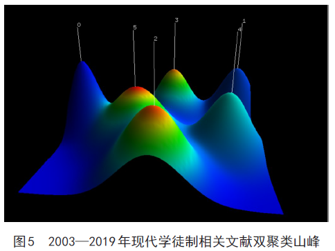 由图5可以看出,6座可视化山丘较为独立,聚类效果较好,图中数字为聚类号,即1代表类1,2代表类2,等等;0号山峰高度最高,代表其内部相似度最高,类内标准差最低,聚类效果最好,主题集中程度也高。由此可以看出,2003—2019年现代学徒制研究主要集中在6个类别。