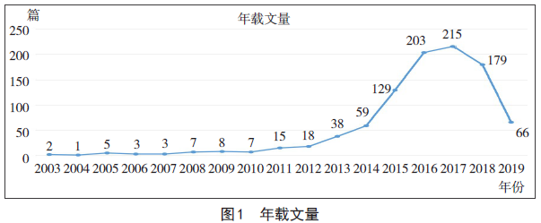 总体来看,2003—2019年现代学徒制研究年载文量呈逐渐上升趋势,年平均发文量为56.4篇。2003—2007年年载文量平均在2.8篇,2004年仅有1篇,这说明在此阶段现代学徒制研究没有引起学界关注。2008—2012年现代学徒制研究在一定程度上取得进展,年载文量平均在11篇,但是整体发文量仍然不足。2013—2017年年载文量有了很大程度的攀升,平均在128.8篇,其中2017年的载文量达到峰值,为215篇,这说明现代学徒制越来越受到研究者的关注,成为研究的热点。2018年年载文量有所下降,为179篇。