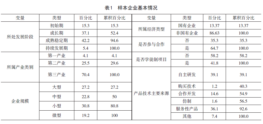 问卷调查采用线下填写与网络填答相结合方式,通过产教融合项目平台、社会团体联盟、行业协会组织等渠道共发放1114份问卷,收回问卷1 077份,问卷回收率为96.7%。样本企业覆盖全国32个省市自治区直辖市(台湾、澳门无样本)89个城市1 077家(表1)。