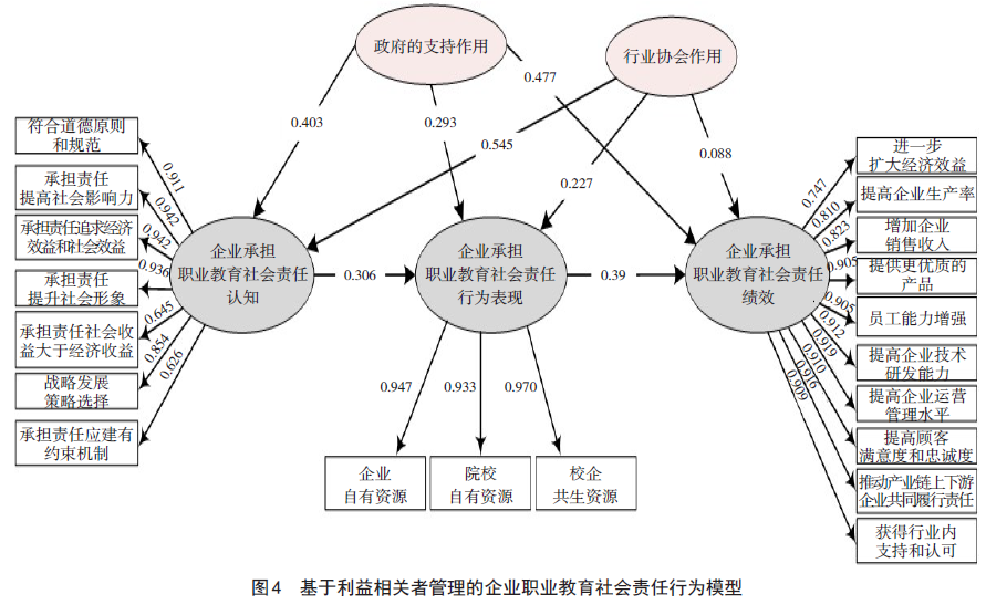 图4呈现了企业对承担职业教育责任理念的认知、企业承担责任的行为、对企业绩效的影响之间的关系以及政府、行业协会对企业承担责任的影响作用。理论模型与观察数据的拟合度较好。企业承担职业教育社会责任的认知对其承担责任的行为有显著的正向影响(β=0.306,p<0 .001),企业承担责任的行为对其绩效有显著的正向影响(β="0.39,p<0.001),政府作为公共主体对企业承担职业教育社会责任的认知、行为、绩效三个环节均有显著的正向调节作用(β=0.403,p<0.001,β=0.293," p<0.001,β="0.477,p<0.001),行业协会作为另一公共主体对企业承担职业教育社会责任的认知、行为、绩效三个环节也均有显著的正向调节作用(β=0.545,p<0.001,β=0.227,p<0.001,β=0.088,p<0.001)。