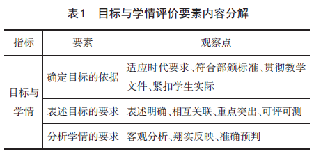 目标与学情是第1项评价指标,有3条评价要素、11个观察点,具体内容见表1所示。