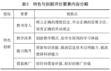 特色创新是第5项评价指标,有4条评价要素、10个观察点,具体内容见表5所示。
