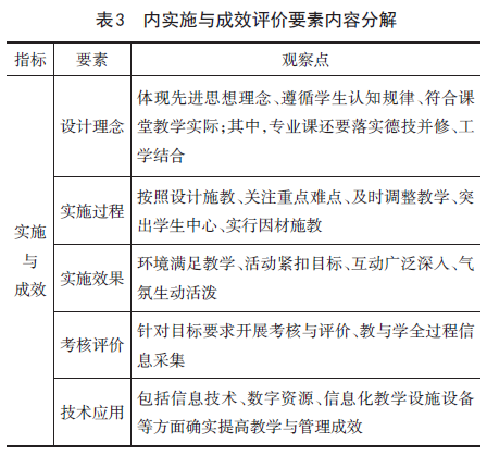 实施与成效是第3项评价指标,有5条评价要素、17个观察点,具体内容见表3所示。