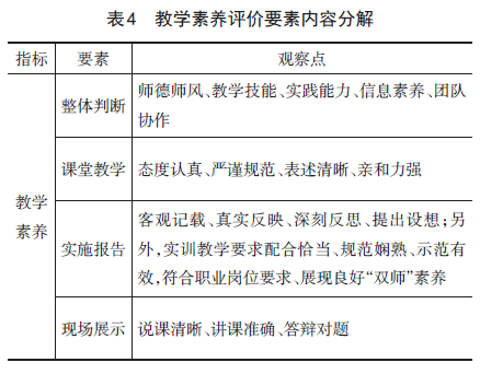 教学素养是第4项评价指标,在网络初评时有3条评价要素、13个观察点,现场决赛时有1条评价要素、3个观察点,具体内容见表4所示。