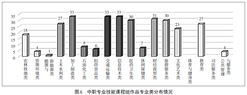参赛作品涉及专业较多的有:学前教育27件(占比8.6%),汽车运用与维修23件(占比7.3%),护理21件(占比6.7%),电子商务14件(占比4.4%),建筑工程施工12件(占比3.8%),中餐烹饪与营养膳食11件(占比3.5%),机电技术应用、计算机应用、高星级饭店运营与管理、旅游服务与管理各9件(占比2.9%),数控技术应用、化学工艺、工艺美术各7件(占比2.2%);以上13个专业的参赛作品占全部专业技能课程组参赛作品的52.4%。另有36个专业只有1件作品参赛。