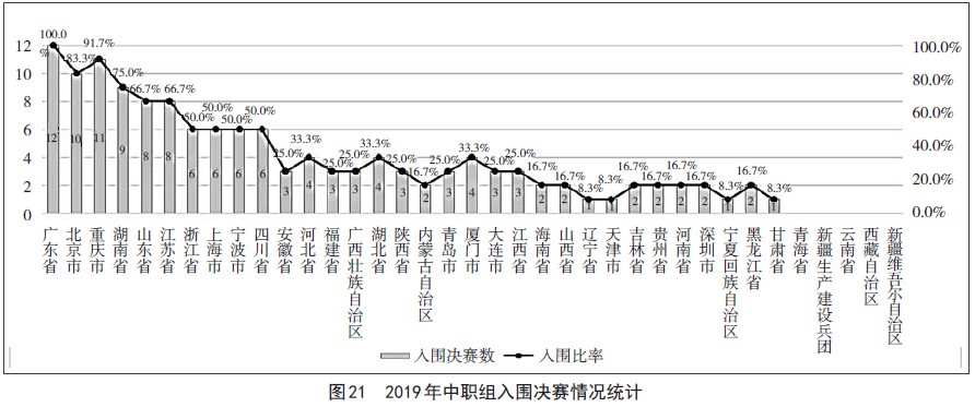 2019年教学能力比赛中职组有32支代表队的参赛作品进入现场决赛。其中,广东代表队的所有参赛作品均入围决赛,重庆、北京、湖南、山东、江苏代表队的入围比例超过2/3,浙江、上海、宁波、四川代表队的入围比例达到1/2。