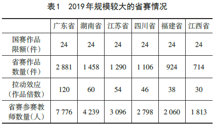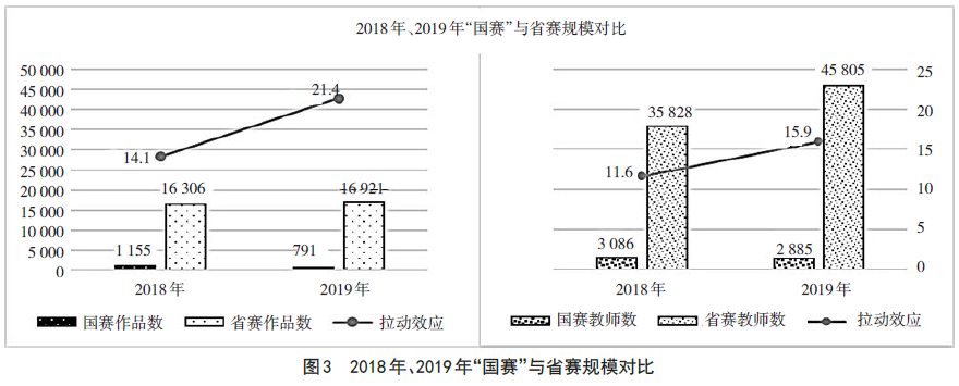 2019年有36支代表队举办了省级比赛,中高职合计参赛作品16921件、参赛教师45805名,与2018年的数据(16306件参赛作品、35828名参赛教师)相比,两组数据都有较大提升,“拉动效应”更加明显。