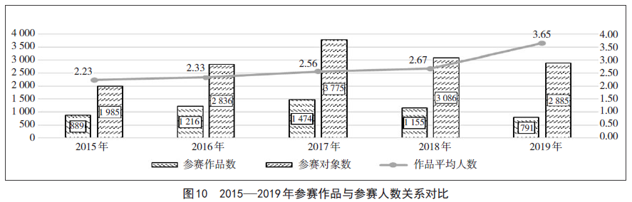 2019年教学能力比赛参赛人数共有2885名,仅次于2017年的3775人和2018年的3086人,而平均每件作品参赛人数为历年比赛新高。