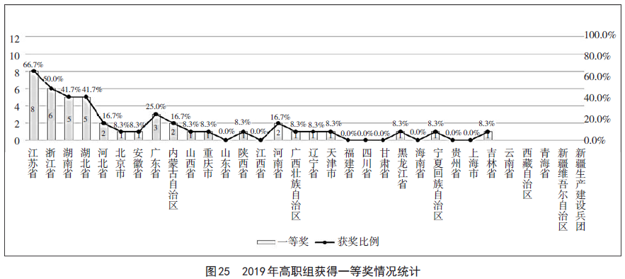 2019年教学能力比赛高职组有19支代表队获得一等奖,具体是:江苏、浙江、湖南、湖北、河北、北京、安徽、广东、内蒙古、山西、重庆、陕西、河南、广西、辽宁、天津、黑龙江、宁夏、吉林。其中,江苏代表队获得8个,浙江代表队获得6个,湖南、湖北代表队各获得5个;这4支代表队获得的一等奖数超过高职组全部一等奖的50%。