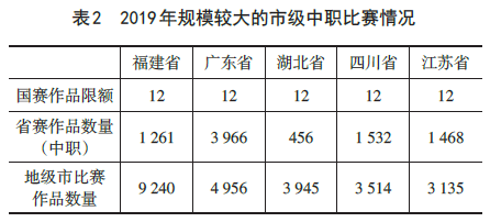 有20个省、自治区单位上报举办2019年市级中职比赛数据,参赛作品总数到达36063件,与2018年的数据(15654件参赛作品)相比,市级比赛持续深入。其中,规模较大的有:福建省、广东省、湖北省、四川省和江苏省。