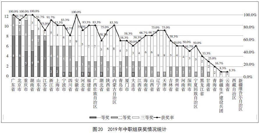 2019年教学能力比赛中职组有35支代表队获得奖项。其中,有29支代表队超过半数参赛作品获得奖项;广东、重庆、湖南、安徽代表队的所有参赛作品均获奖,如图20。