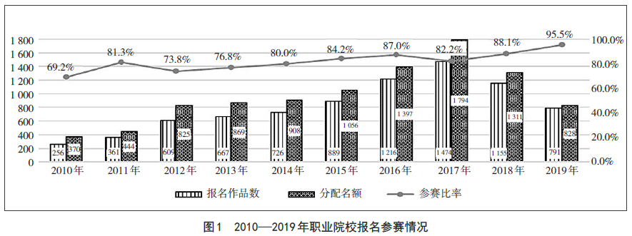 2019年教学能力比赛中职组、高职组分别限额12件参赛作品,分配名额共828件(中职组444件、高职组384件)。实际各代表队报名参赛作品共有791件,总体参赛比率(参赛作品/参赛限额)到达95.5%,创历史新高。