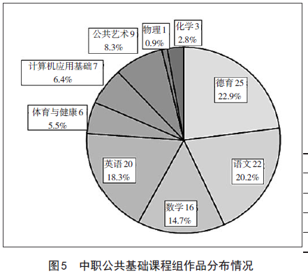 在109件公共基础课程作品中,德育(包括职业生涯规划、职业道德与法律、经济政治与社会、哲学与人生、心理健康等五门课程)25件(占比22.9%)、语文22件(占比20.2%)、英语20件(占比18.3%)、数学16件(占比14.7%)、公共艺术9件(占比8.3%)、计算机应用基础7件(占比6.4%)、体育与健康6件(占比5.5%)、化学3件(占比2.8%)、物理1件(占比0.9%)。