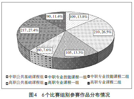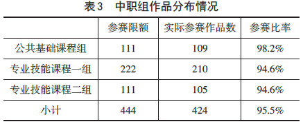 中职组公共基础课程作品有109件,为参赛限额的98.2%,该组参赛比率高于专业技能课程一组、专业技能课程二组的参赛比率。