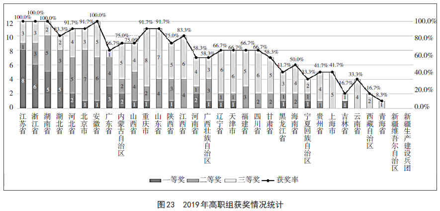 2019年教学能力比赛高职组有30支代表队获得奖项。其中,有22支代表队超过半数参赛作品获得奖项;江苏、浙江、湖南、安徽代表队的所有参赛作品均获奖。