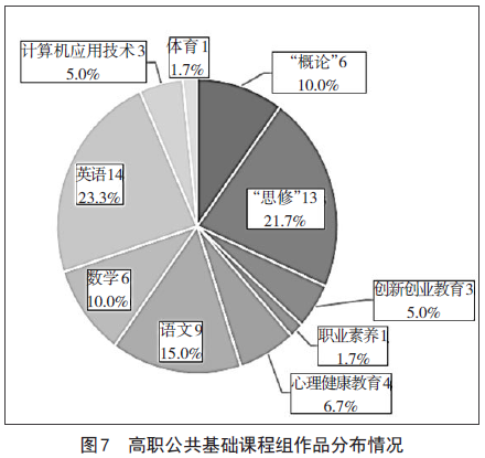 在60件公共基础课程作品中,思想道德修养与法律基础13件、毛泽东思想和中国特色社会主义理论体系概论6件,上述两门思政课程占比31.7%;英语14件(占比23.3%)、语文9件(占比15.0%)、数学6件(占比10.0%)、心理健康教育4件(占比6.7%)、创新创业教育和计算机应用技术各3件(各占比5.0%),职业素养和体育各1件(各占比1.7%)。