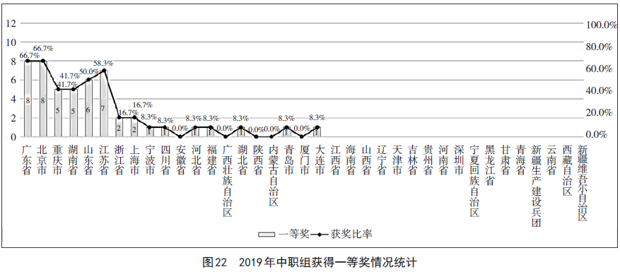 2019年教学能力比赛中职组有15支代表队获得一等奖,具体是:广东、北京、重庆、湖南、山东、江苏、浙江、上海、宁波、四川、河北、福建、湖北、青岛、大连。其中,广东、北京代表队各获得8个,江苏代表队获得7个,山东代表队获得6个,重庆、湖南代表队各获得5个;这6支代表队获得的一等奖数接近中职组全部一等奖的80%。
