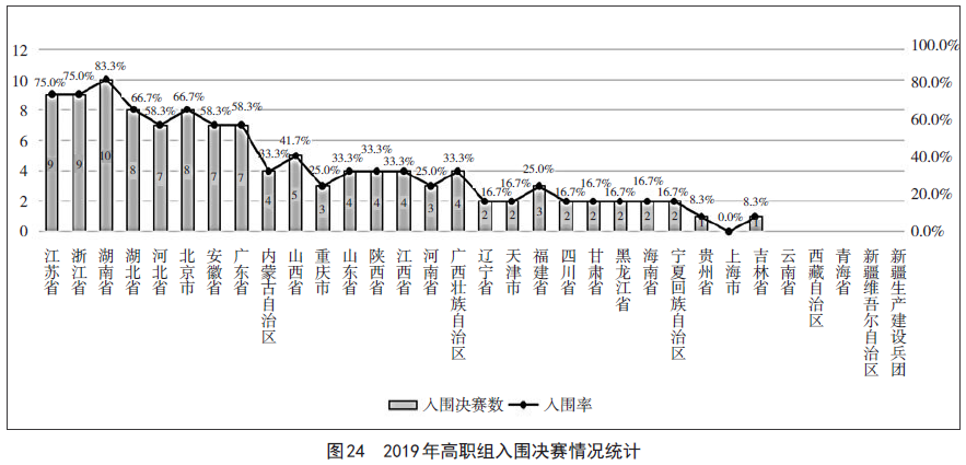 2019年教学能力比赛高职组有26支代表队的参赛作品进入现场决赛。其中,湖南、江苏、浙江、湖北、北京代表队的入围比例超过2/3,河北、安徽、广东代表队的入围比例超过1/2。