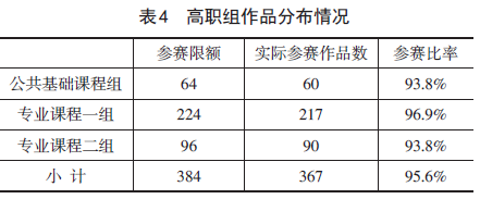 高职组公共基础课程作品有60件,为参赛限额的93.8%,该组参赛比率低于专业课程一组、与专业课程二组相当。