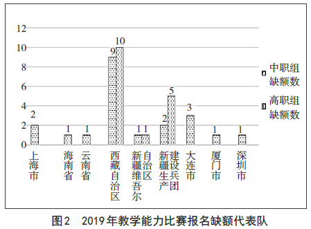 2019年教学能力比赛有28支代表队足额报名,占代表队总数的75.7%。其中,中职组共缺额作品20件,涉及8支代表队(占比21.6%);高职组共缺额作品17件,涉及4支代表队(占比12.5%)。