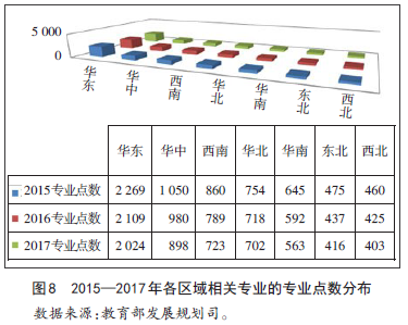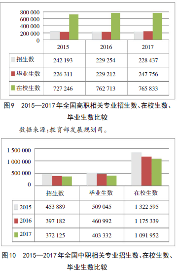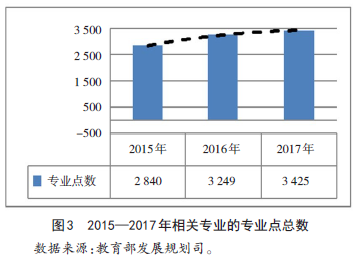 (1)相关专业布点情况。从高职专业点规模来看,2015—2017年,高职相关专业点总数稳步增长。