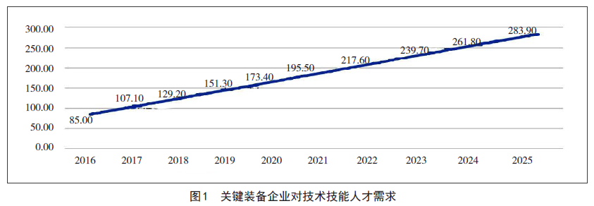 (1)智能制造关键装备企业的技术技能人才需求预测。工信部发布的《“十二五”智能制造装备产业发展规划》指出,2015年智能制造装备产业销售收入预计超过1万亿元,2020年建立完善的智能装备产业体系,产业销售收入将超过3万亿元。从2015年产值1万亿到2020年产值3万亿,增长2万亿元,平均每年增长4 000亿元。调查发现,智能制造机械行业企业人均销售额平均值为100万元,企业工作全体人员中10%~15%为管理人员,85%以上为包括设计、生产工艺和销售及售后服务人员的技术技能人员。按照人均产值100万计算,每年需要新增40万人,得到相关增速线性曲线并拟合数据,乘以0.85后得到企业技术技能人才需求的总数。