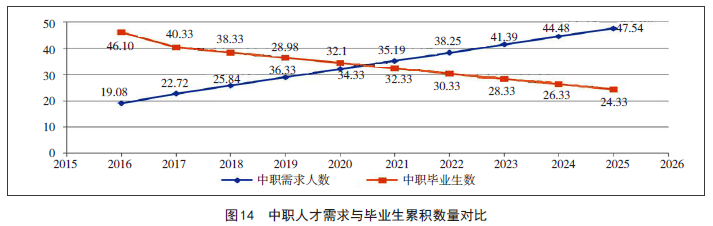 对比智能制造行业人才需求数量和中高职相关专业人才培养规模,按照高职智能制造相关专业现有招生规模以及中职毕业生数量不断下降的趋势计算,高职层次毕业生数远远不能满足企业需求,而中职毕业生数供大于求。不过由于生源基数自然减少,中职毕业生数连年大幅度下降,2021年趋于供需平衡,在2021年以后中职毕业生将供不应求,因此,在2021年后应增加中职招生规模。
