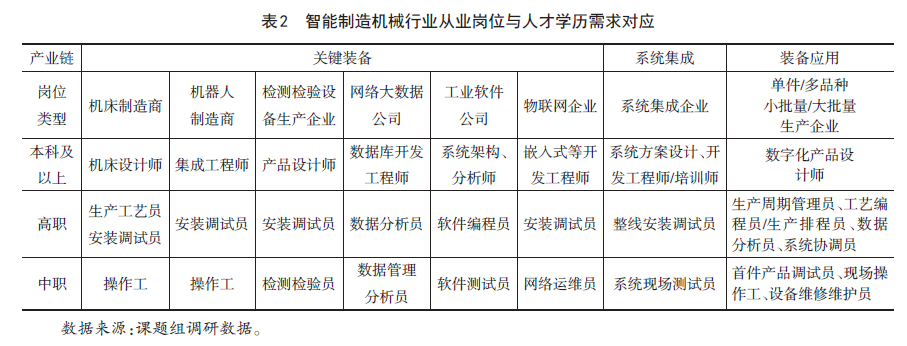 智能制造机械行业技术技能人员从业岗位主要来自智能制造关键装备、系统集成和装备应用的三种生产企业,包括机床设备制造商、工业机器人制造商、检测检验企业、系统集成企业、应用生产企业等岗位,同时调查发现,在原有职业岗位基础上,新出现了数据分析员、智能生产排程员、生产周期管理员、首件产品调试员等岗位,智能制造机械行业不同学历层次人员的从业岗位。