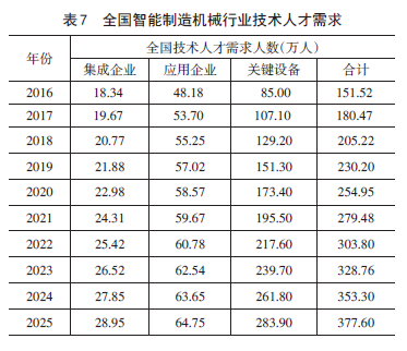 (3)全国智能制造技术技能人才需求总数预测。将智能制造关键装备、系统集成和装备应用三方面企业需求人才合并统计,得到全国智能制造机械行业技术人员总需求量。