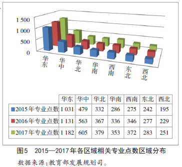 (2)相关专业区域分布情况。全国高职院校智能制造机械类专业分布不均,华东、华中两地区专业点最多,占全国50%以上。2015—2017年间,各区域专业点均呈增长趋势,西部地区增幅最大,西南、西北地区增幅分别为35.3%、28.7%;东中南部地区增幅次之,华中、华南地区增幅为26.3%、23.4%;东北、华东、华北地区增幅最低,都在17%以下,分别为16.9%、14.6%、12.4%。对比来看,智能制造专业点开设少的西部地区,新开设专业点的速度高于智能制造专业开设多的东部地区。