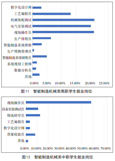 调查发现,高职相关专业毕业生就业岗位以传统岗位居多,最主要的有机械装配调试、电气安装调试、现场操作员和工艺编程员等岗位,而智能机械制造类新岗位不多,主要原因是多数企业智能制造岗位分工不明晰,普遍存在传统岗位混合新工作内容。目前,独立设置的智能制造相关新岗位主要集中在大型企业。中职毕业生主要就业岗位为现场操作员、物流转序员、设备安装调试员,与高职存在较大差异。