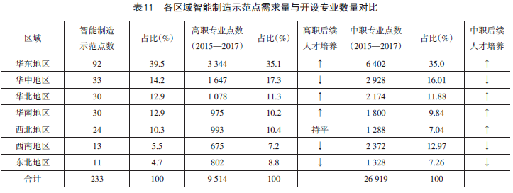 对比各地区智能制造示范点占比与职业院校开设专业点占比,华东、华北、华南地区职业院校专业点占比略有不足,西北地区中职不足,需要补充;华中、东北、西南地区,中高职专业占比高于示范点占比,西北地区高职基本持平,不需要有大的调整。