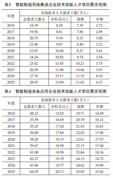 图2为全国系统集成和装备应用企业技术技能人才需求总量预测思路流程图。其中,经实地调查发现中小企业由于工业化进程不一致,用工较多,经与上市大企业相比较,技术人员需求量有较大差别,存在1∶25比例关系。经测算,2016—2025年全国智能制造集成企业与装备应用的人才需求情况详见表5、表6。