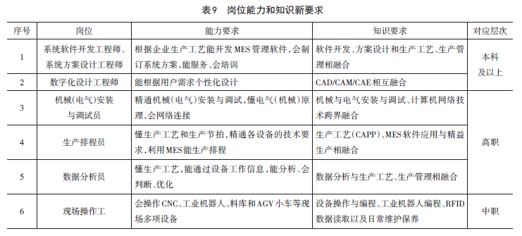 在中国制造强国背景下,智能制造机械行业技术技能岗位的职责和能力要求出现了新变化:一是智能机械制造岗位能力需求进一步升级,岗位职业能力向多元化、复合型发展。不仅要求数字化设计人员在熟练掌握计算机辅助设计(CAD)、计算机辅助制造(CAM)基础上掌握计算机辅助工程(CAE)仿真分析方法;操作岗位被机器人替代后,生产管理人员要掌握计算机辅助工艺规划(CAPP)技术,具备设备布局、智能排产等新职业能力。二是精益生产管理岗位需求加大,要求将跨界协同工作的新技术、新软件与管理方式融入企业精益化智能制造生产中。结合行业和岗位变化,针对不同的技术技能岗位梳理出不同能力和知识的新要求,其中包含了许多跨界、跨学科的复合型能力要求。