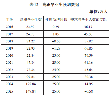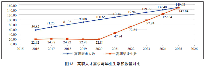 根据人才需求预测,可以看到高职人才缺口较大。若要在2025年满足人才需求,则高职院校智能制造相关专业需要每年增加25万人左右。根据2017年3 425个专业点数计算,每个专业点数新增约73个,即在原来招生规模基础上每年招生规模增加25万,到2025年高职院校智能制造机械类相关专业的毕业生总量将达到148万人左右,与企业需求的149万基本持平,人才供需矛盾得到初步解决。如果增加每年招生人数,则需求与供给匹配时间将会提前。