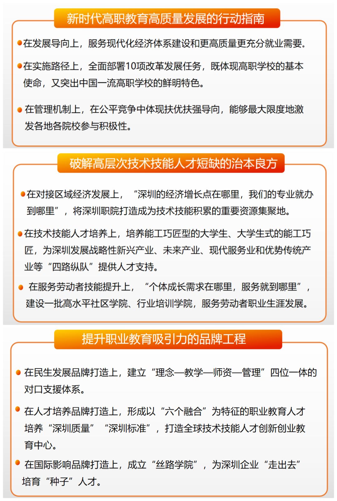深圳职院将为职业教育服务建设现代化经济体系提供示范引领,为粤港澳大湾区建成国际科技产业中心提供人才支撑,为我国企业开发海外市场提供先行服务。