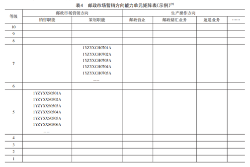 纵向为能力单元对应的资历框架等级,横向为行业结构表的不同方向和职能。由于采用切片式开发方式,除了“市场营销方向”的“销售”和“策划”职能,其他方向下的能力单元都还是空白。但随着其余方向及职能下的能力单元的开发,这张矩阵表将逐渐被填满,最终完成邮政整行业的能力标准的开发。