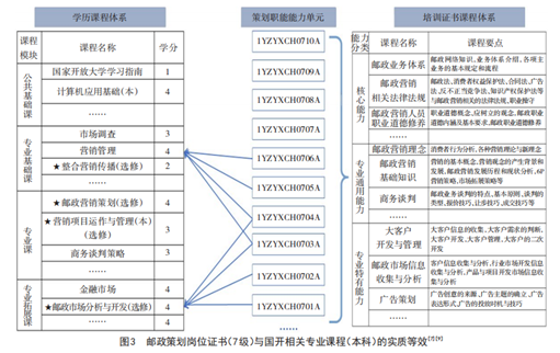 可以看到,国开的学历课程与邮政的证书课程名称并不完全一致,但由于双方有共同的能力单元,因此,可以厘定证书课程与学历课程的实质等效部分。如图3所示,邮政营销人员岗位资格培训证书(中级)的一系列课程能够实现所有策划职能的能力单元要求,相应地,国开也有几门课,例如营销管理和邮政市场分析与开发,也基于能力单元构建。说明基于相同的能力单元,邮政营销人员岗位资格培训证书(中级)的学习结果与国开的几门学历课程等效。这为后续证书课程与学历课程进行成果转换提供了实质等效的依据和可能性。