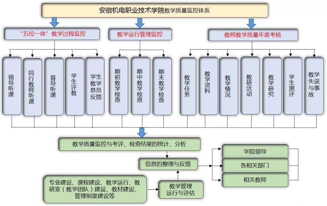 形成了集领导听课、督导听课、同行听课、学生信息员反馈和教学质量分析反馈五位一体的教学过程监控机制。制定《教师教学质量考核管理办法》,建立教师教学质量考核机制,对教师教学情况、任务、教研等七大方面进行年度量化考核。制定《安徽机电职业技术学院教学诊断与改进工作实施方案与工作规划》等制度,实施教学工作诊改。实施期初、期中、期末教学检查工作,形成常态化的教学运行监控机制。